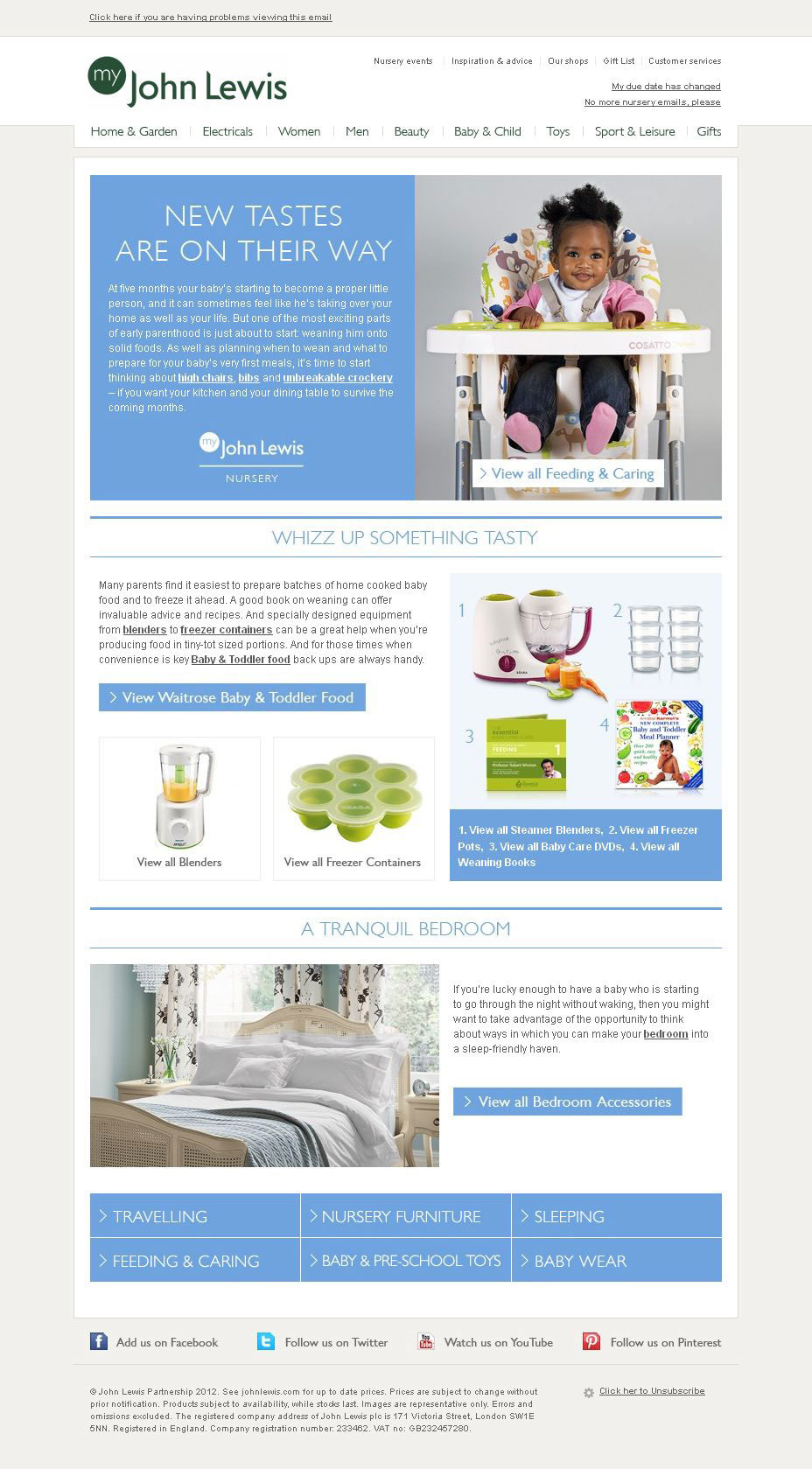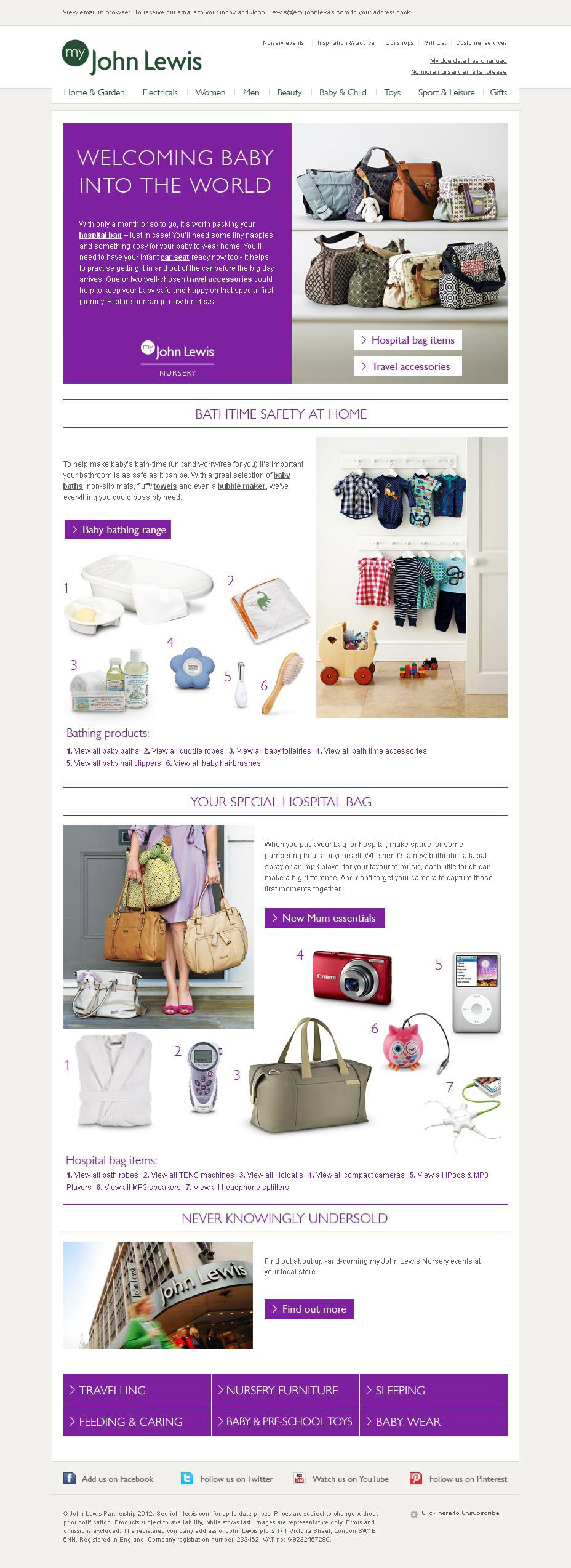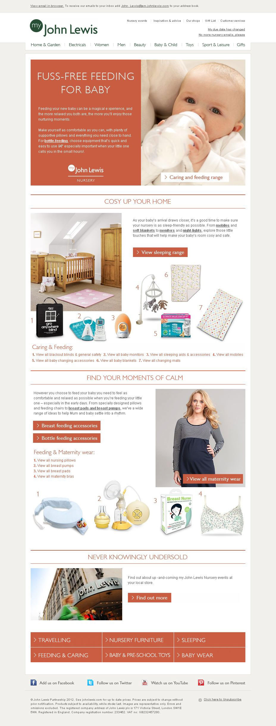 These emails were created for the John Lewis customer retention marketing team. They were part of a trigger campaign that sent tailored maternity newsletter to expectant mothers who signed up to the scheme.